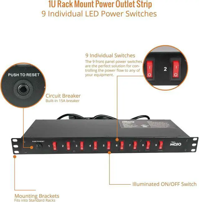 Tecmojo 9-Outlet Rack Mount Overloading Protection Circuit Breaker PDU Power Strip with Individual Switch 6ft Cord for IT and Network Racks and Cabinets