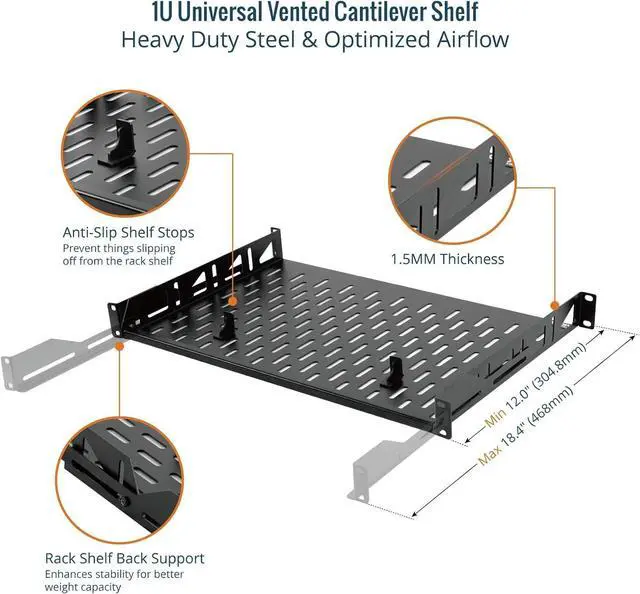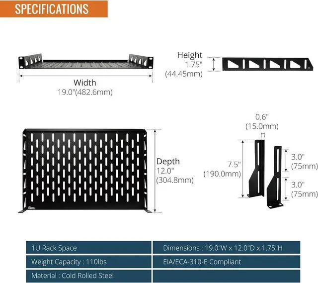 Sturdy:1U Server Rack Shelf is made of 1.5MM thickness cold rolled steel, weight load capacity is 110lbs(50kg); Electrostatic powder coat preventing rust and corrosion