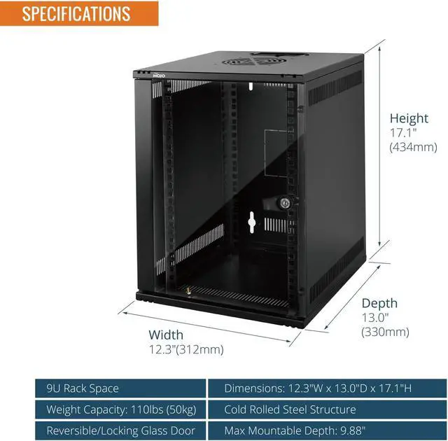 Compact 6U Wall Mount Design: Measures 12.3W x 13D x 11.8H with a reversible tempered glass locking door,6u 10 inch rack offering secure, organized storage in tight spaces.Max mountable depth 251MM