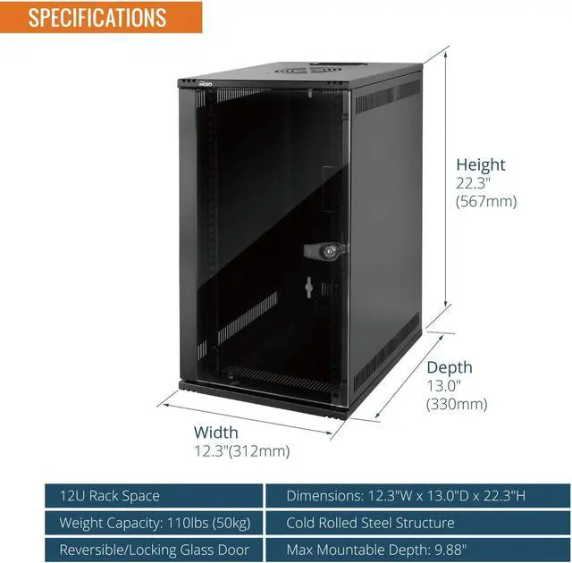 Compact 6U Wall Mount Design: Measures 12.3W x 13D x 11.8H with a reversible tempered glass locking door,6u 10 inch rack offering secure, organized storage in tight spaces.Max mountable depth 251MM