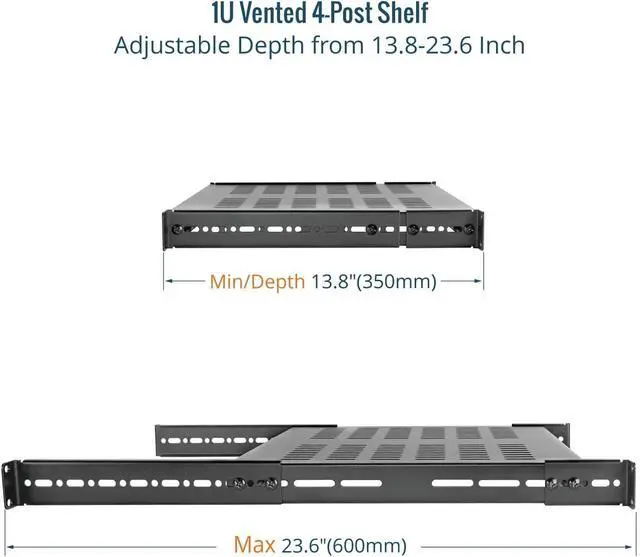 Universal 19" Fit: This 1U 4-post server rack mount shelf is designed to fit 19in server racks and cabinets,fixed surface depth of 21.7in,adjustable mounting depth from 13.5 to 31.8in,according to the depth of the rack