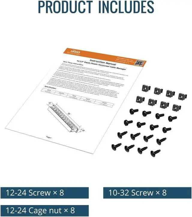 Easy to use:This rack mount cable management is easy to install,with instructions or videos for reference;Accessories including 12-24 Cage nut and Screw×8,10-32 Screw×8,you can choose according to the actual installation