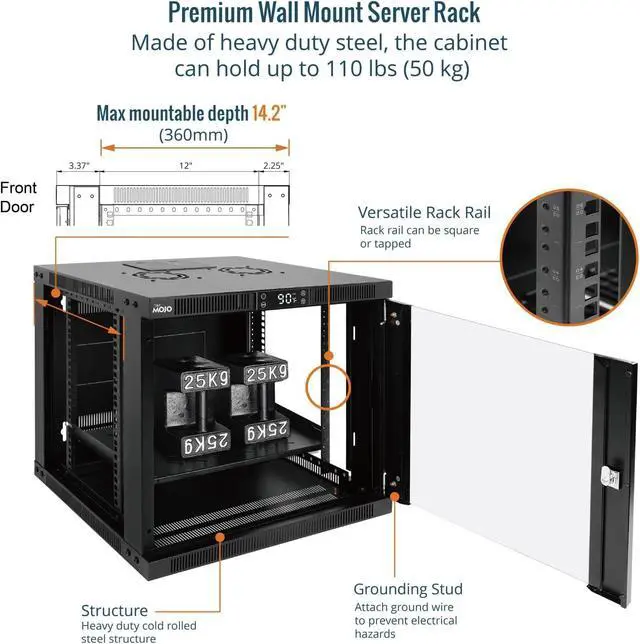 Space-Saving Design: Compact 12U wall mount rack (21.7" W × 17.7" D × 24.9" H) with 14.2" max mounting depthideal for networking, IT, AV, and surveillance system installations