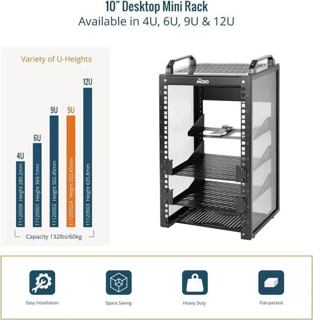 Compact 10-Inch Width & 9U Height: This mini rack is designed for efficient equipment organization, featuring a space-saving 10-inch width and standard 9U height - ideal for desktops, home labs, small offices, or AV setups