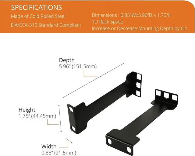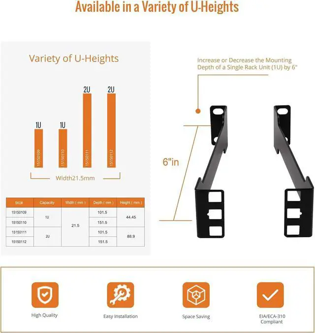 Widely Applicable:EIA/ECA-310 Compliant;1U, 2U Recessed rack adapter with different depth 4, 6 are available; Suitable for NVR, dell ready rail, switch, router, SFP modules in data/audio/IT rack