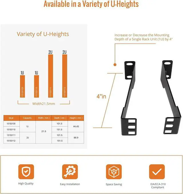 Widely Applicable:EIA/ECA-310 Compliant;1U, 2U Recessed rack adapter with different depth 4, 6 are available; Suitable for NVR, dell ready rail, switch, router, SFP modules in data/audio/IT rack