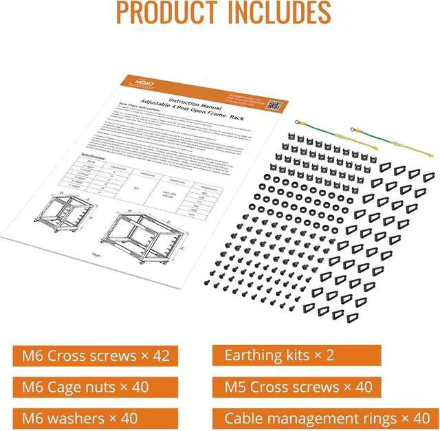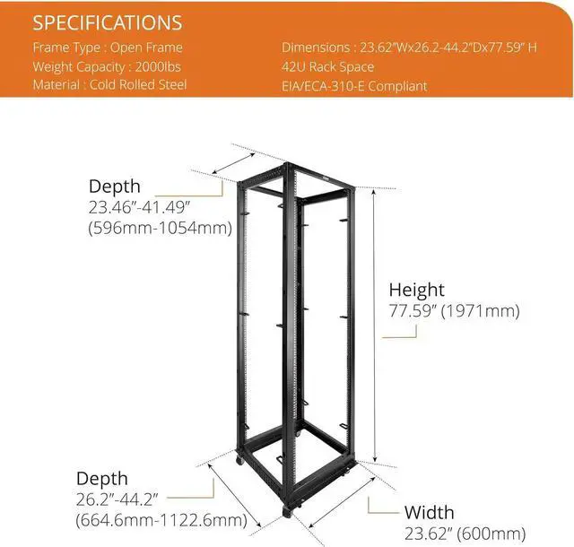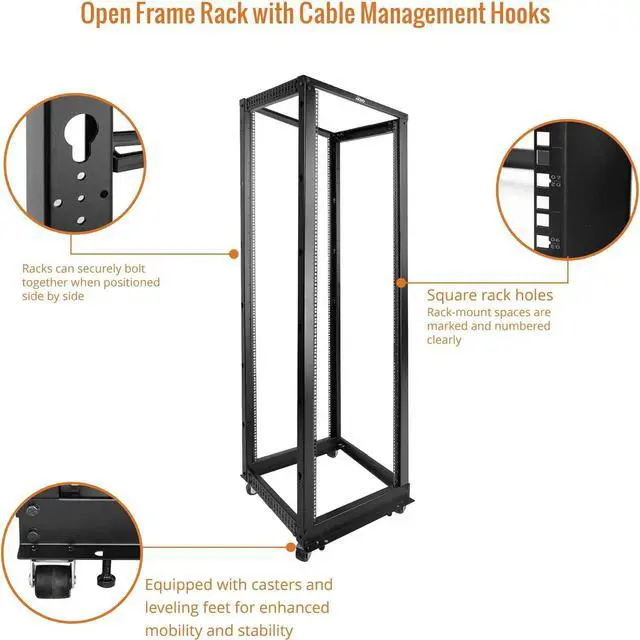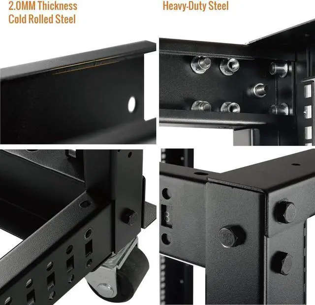 Durable: Open frame server rack made from 2.0mm heavy duty cold rolled steel;Weight capacity is up to 2000lbs; Electrostatic powder coat preventing rust and corrosion