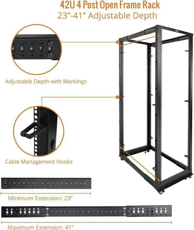 Flexible Use: Adjustable depth from 23.46 to 41.49in,meeting the storage needs of equipment in different depths; equipped with extra cable management hooks for cable mangement