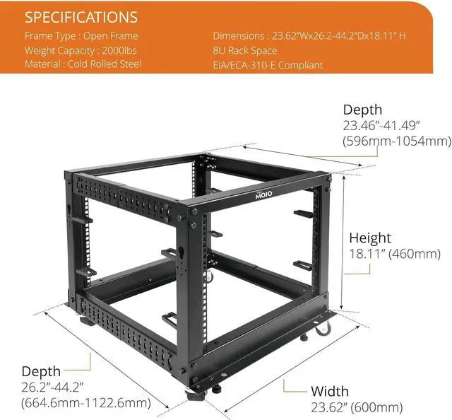 Durable: Open frame server rack made from 2.0mm heavy duty cold rolled steel;Weight capacity is up to 2000lbs; Electrostatic powder coat preventing rust and corrosion