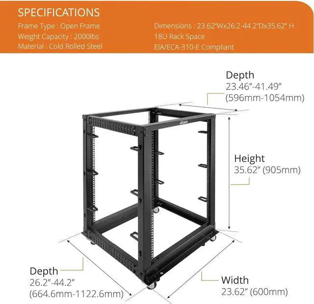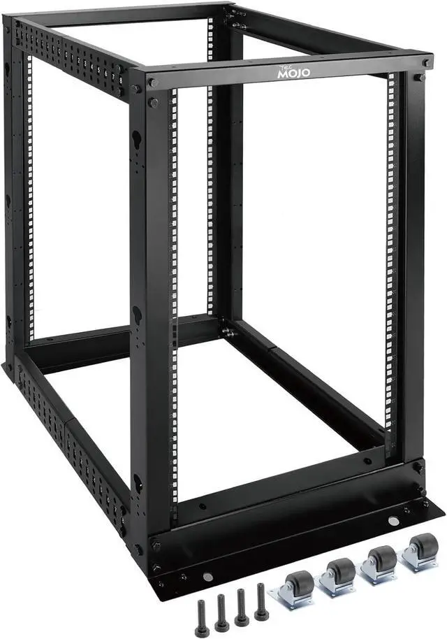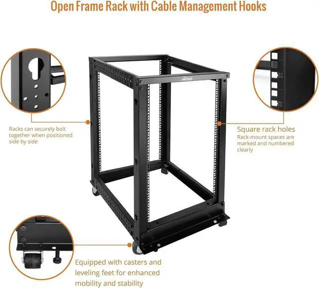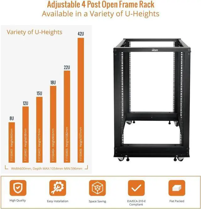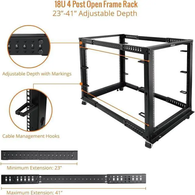 Durable: Open frame server rack made from 2.0mm heavy duty cold rolled steel;Weight capacity is up to 2000lbs; Electrostatic powder coat preventing rust and corrosion