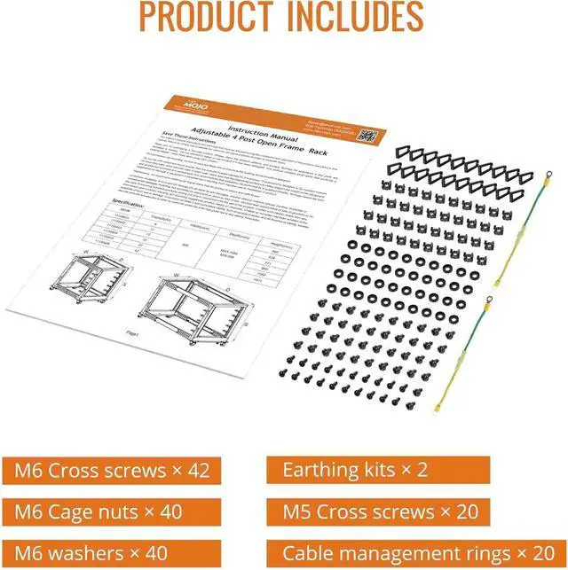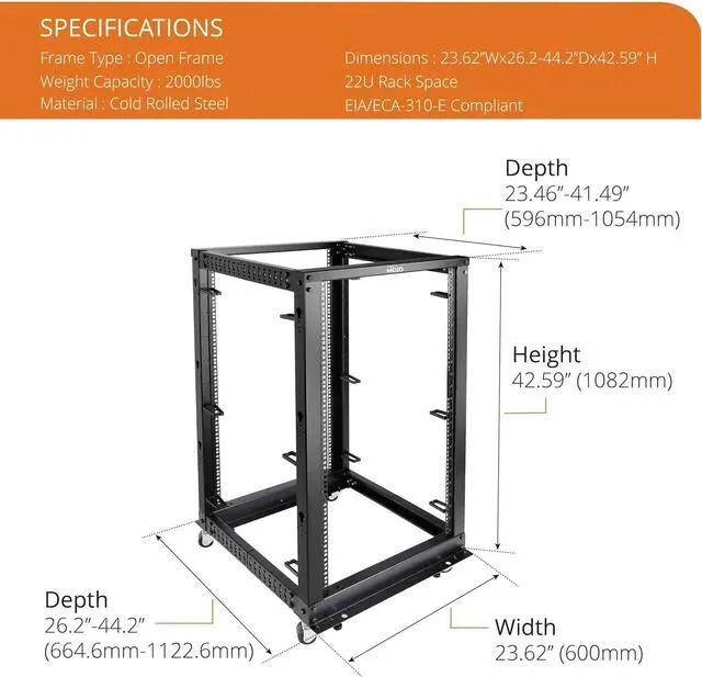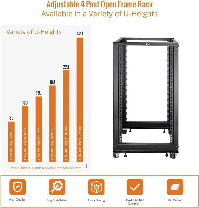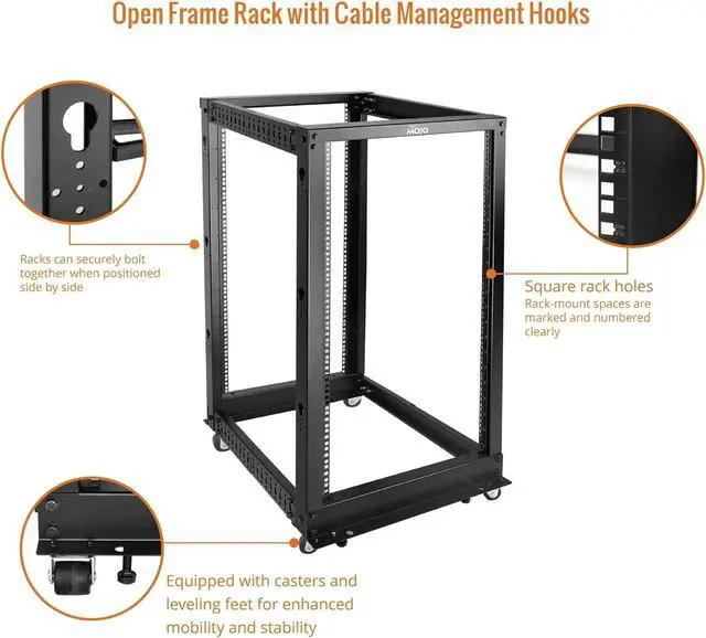 Durable: Open frame server rack made from 2.0mm heavy duty cold rolled steel;Weight capacity is up to 2000lbs; Electrostatic powder coat preventing rust and corrosion