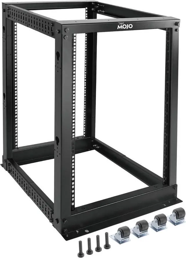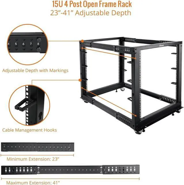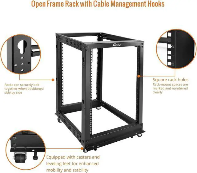 Durable: Open frame server rack made from 2.0mm heavy duty cold rolled steel;Weight capacity is up to 2000lbs; Electrostatic powder coat preventing rust and corrosion