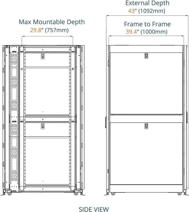 4. The enclosure features adjustable square untethered cage nut opening mounting rails with u-markings for convenient equipment mounting