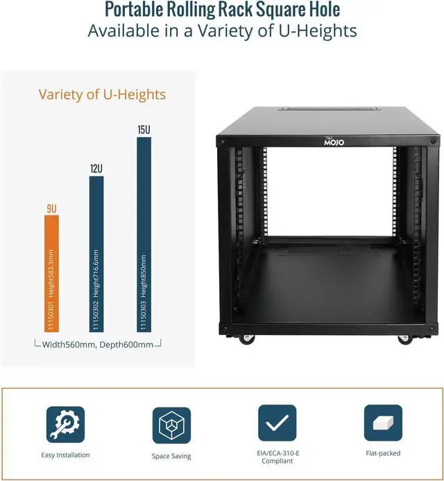 Universal: EIA/ECA-310-E compliant; Equipped with installation M6 cage nuts and screws; Available in 9U, 12U, 15U