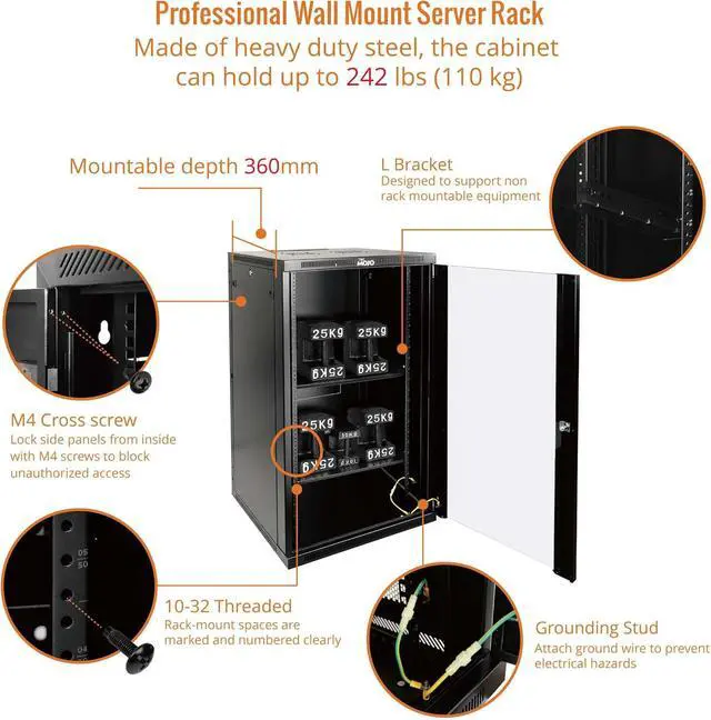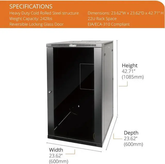 Premium Steel Construction: 22u server rack is built from high-quality cold-rolled steel with a durable powder-coated finish, the Tecmojo Elite Series cabinet supports up to 176 lbs when wall-mounted and 350 lbs when floor-mounted, ensuring a robust housing solution for IT and server equipment