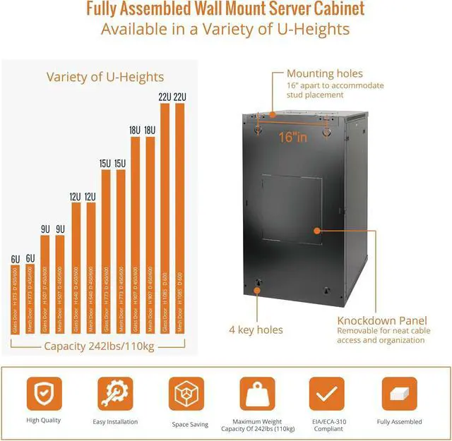 Included Accessories: wall mount network rack includes a 1U cantilever shelf and L-shaped brackets for non-rack equipment, optimizing storage efficiency. The networking cabinet is compliant with CE, PCI, EIA/ECA-310-E, NEMA Rated Type-1, and HIPAA standards