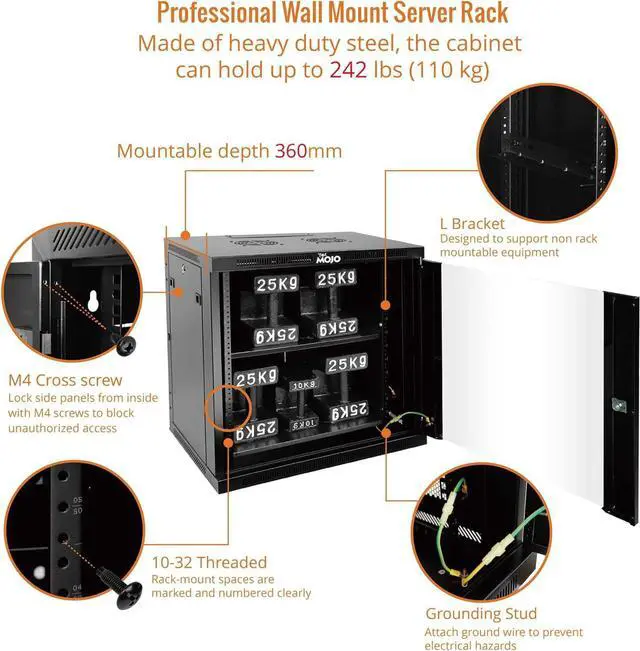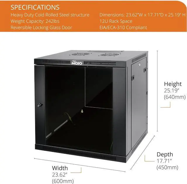 Premium Steel Construction: 22u server rack is built from high-quality cold-rolled steel with a durable powder-coated finish, the Tecmojo Elite Series cabinet supports up to 176 lbs when wall-mounted and 350 lbs when floor-mounted, ensuring a robust housing solution for IT and server equipment