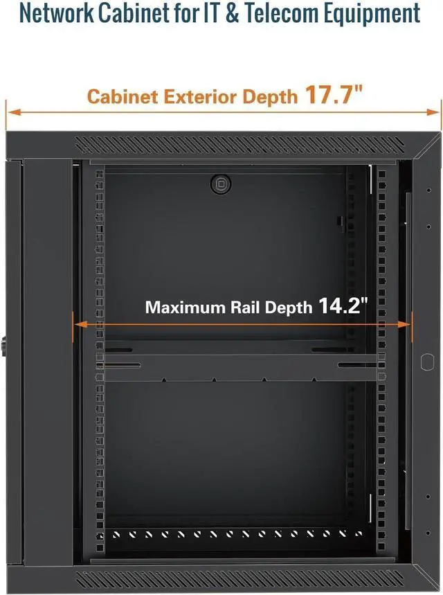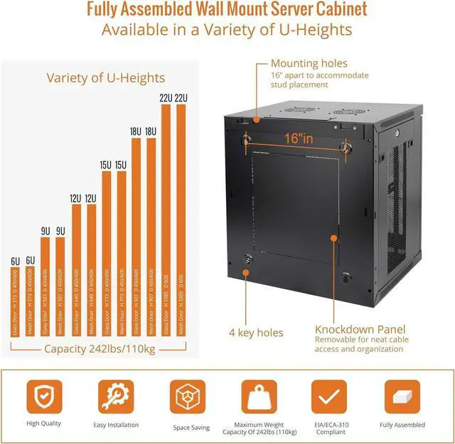 Included Accessories: wall mount network rack includes a 1U cantilever shelf and L-shaped brackets for non-rack equipment, optimizing storage efficiency. The networking cabinet is compliant with CE, PCI, EIA/ECA-310-E, NEMA Rated Type-1, and HIPAA standards