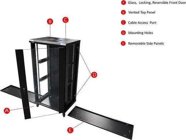 Rugged welded frame structure with reinforced lockable doors and side panels ensure data safety. High quality SPCC cold rolled steel with powdered coated finish.