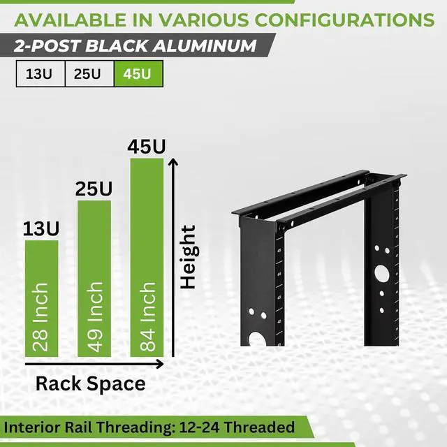 • DURABLE 45U 2 POST SERVER RACK - Constructed from high-quality aluminum with a black powder-coated finish, this NavePoint 45U 2-post rack supports up to 661 lbs making it ideal for mounting substantial IT hardware. Dimensions: 13.4"L x 20.25"W x 84"H. This rack is designed for compatibility with 19 standard equipment.