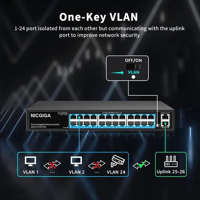 One-Key VLAN mode for enhanced security: The 26-port power over ethernet switch features a One Key VLAN mode that isolates the 1-24 ports from each other while still communicating with the uplink ports, improving network security and bandwidth utilization.