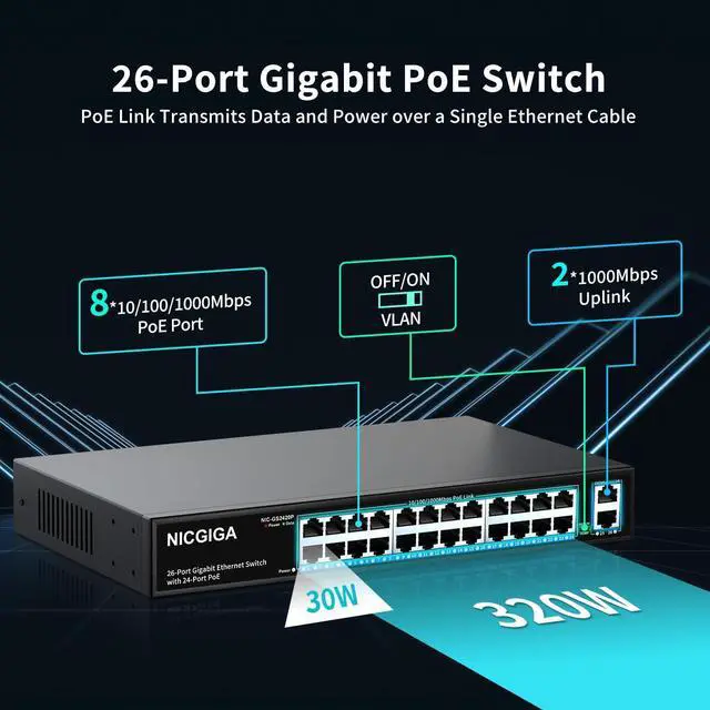 24 Port Gigabit PoE+ switch, total Max 320W internal power budget, up to 30W per PoE port, add-on 2 gigabit uplink port, IEEE 802.3 af/at compliant, automatically detects and identifies PD devices.