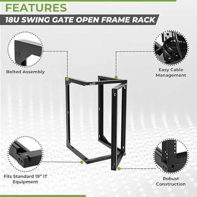 EASY EQUIPMENT ACCESS - The dual-hinged front swing gate on the 18U open frame rack opens 180 degrees, from either left or right, enabling easy access to rear panels and cables for servicing and management. The 18U server rack front gate can also be completely removed during assembly or maintenance and easily reattached.