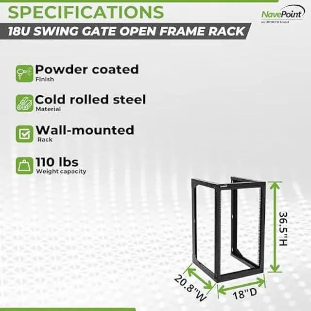 SPECIFICATIONS - The NavePoint 18U network rack is built from 1.5 mm cold-rolled steel, finished with black powder coating for durability. Its dimensions are 18L x 20.8W x 36.5H, designed for standard 19 servers, AV and networking equipment, and it can carry a maximum weight of 110 lbs. The IT rack has a depth of 18 inches.