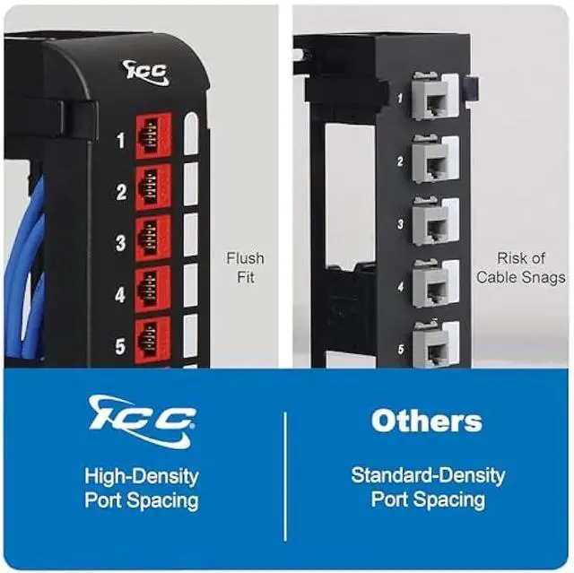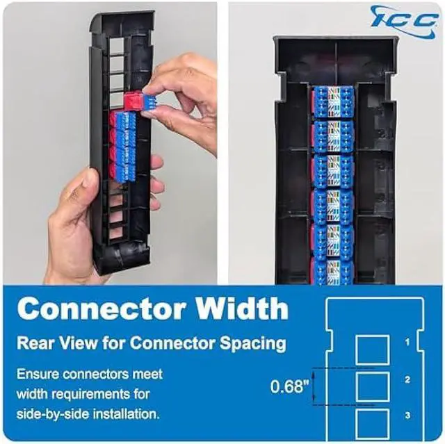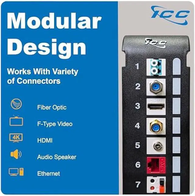 MODULAR DESIGN: Compatible with slim-profile keystone jacks, including CAT6A, CAT6, CAT5e, HDMI, RCA, USB, and F-Type, for flexible configurations in data, voice, audio, and video applications. Use with ICCs Keystone Connector Removal Tool (SKU: ICACSP481) for quick and easy connector removal in high-density installations.