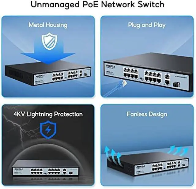 Plug and PlaySODOLA 16 Port Unmanaged PoE Switch Support automatically detect devices, easy to setup with no software installation or configuration required.