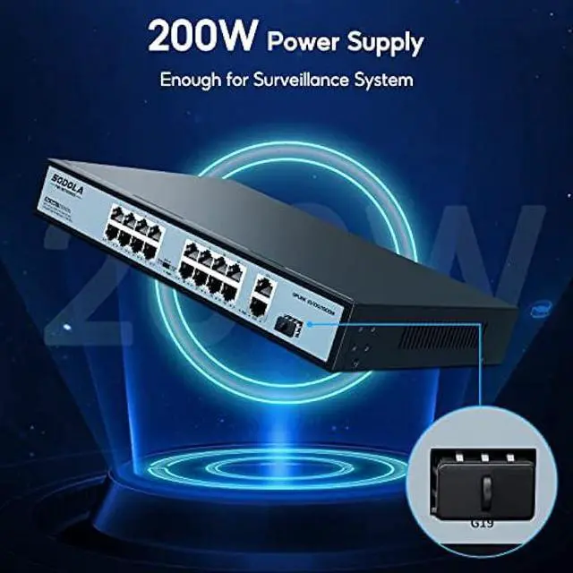 16 Port PoE Switch16*10/100Mbps PoE Ports&2* Gigabit Ethernet Uplink. 1 more SFP Slot interface added, can provide more bandwidth and connect to different devices. Different speed ports combo can make full use of switch at low cast for surveillance system.
