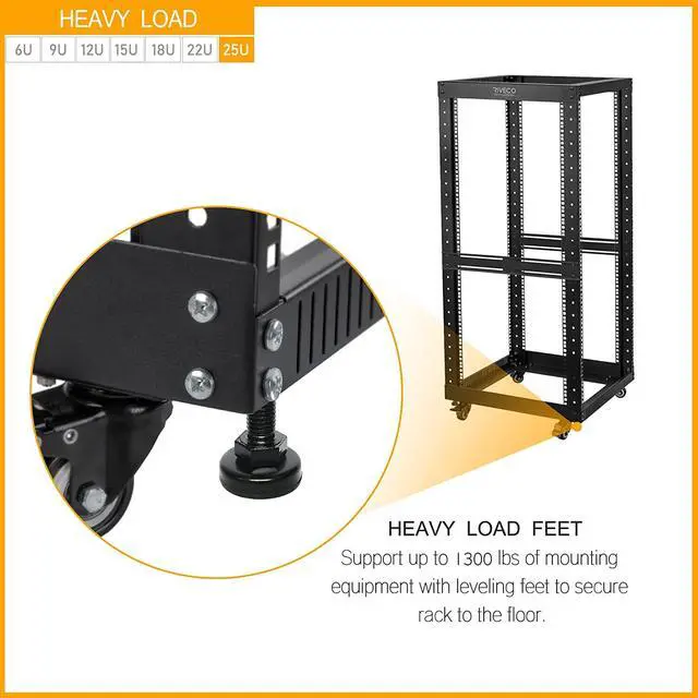 *STURDY: 4-post construction, heavy-duty, SPCC cold-rolled steel can safely support up to 1300 lbs. 600kgof rack mounting equipment with level feet, and 700 lbs. (320kg) with the casters. The black RAL9005 powder coat finish makes this 25u rack resistant to scratching and rusting.