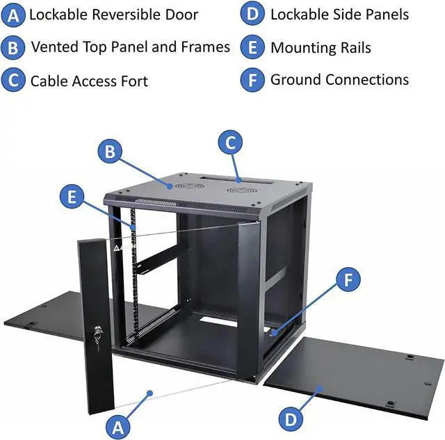 Removable and reversible front door and removable side panel with lock, each with quick-release mechanism. The vented frames and optional cooling fans provide excellent air ventilation.