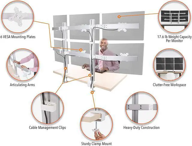 Universal Monitor Fit - This robust 6 monitor stand accommodates screens from 17 to 32 inches, supporting up to 17.6 pounds each, with a sturdy metal base ensuring secure placement.