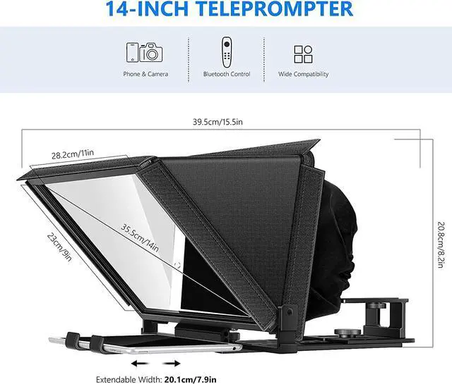 Wide Compatibility The teleprompter can fit all models of smartphones or tablets up to 9.84 " x 8.68 " / 25cm x 22cm, compatible with iPad iPad Air iPad Pro 11", etc. Its lens hood can be adjusted to suit cameras and mobile phone lenses of various sizes.