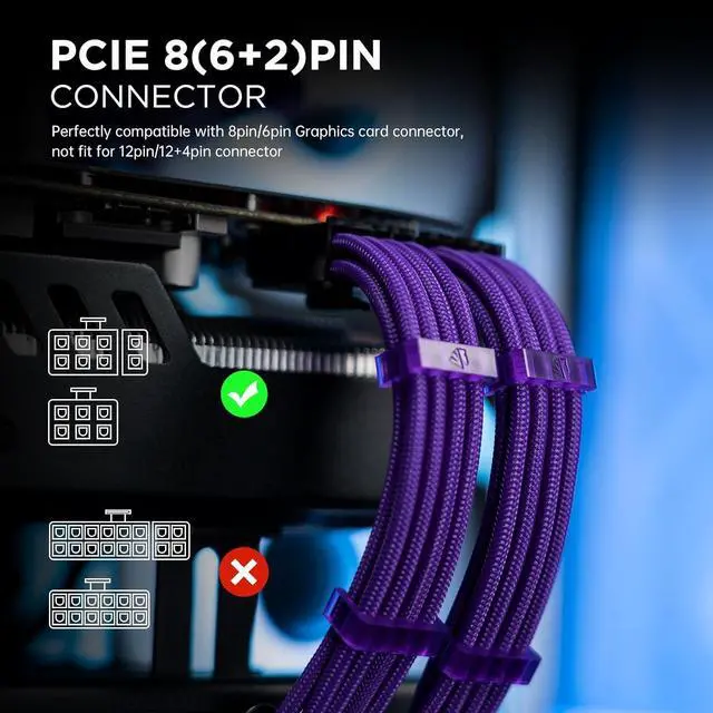 PSU Extension Cable Kit1x24 Pin ATX Extension Cable (for Motherboard), 1x (4+4) Pin EPS Cable (for CPU), 2 x 6+2-Pin PCI-e Cable and 2 x 6-Pin PCI-e Cable (for GPU), supplied two sets of cable combs, compatible with all power supply cables (must be connected to the power cable, not to the power supply)