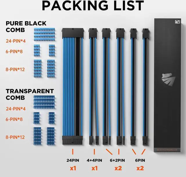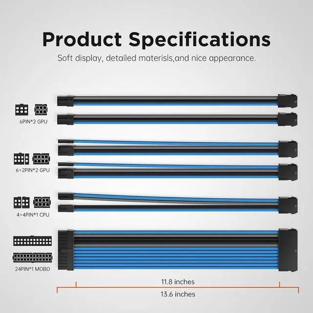 Pc Cable Extension Kit1x24 Pin ATX Extension Cable (for Motherboard), 1x (4+4) Pin EPS Cable (for CPU), 2 x 6+2-Pin PCI-e Cable and 2 x 6-Pin PCI-e Cable (for GPU), supplied two sets of cable combs, compatible with all power supply cables (must be connected to the power cable, not to the power supply)