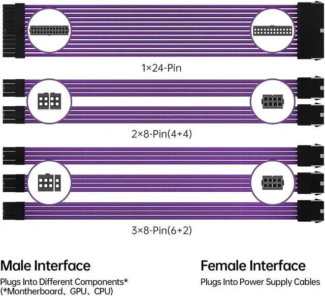 Support Double CPU MotherboardAsiahorse pc power cable contain 1 x 24 Pin ATX Extension Cable, 2 x 4 + 4 Pin EPS Cable for CPU extension cable, 3 x 8 to 6+2 Pin PCI-E Cable for GPU extension cable. 2 x dual 4+4PIN CPU power cables support Double CPU M/B for Two-way performance.