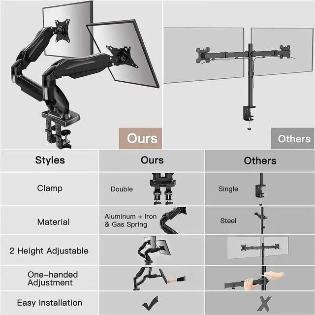Comfort Is Fundamental - Our dual monitor arm for desk raises monitors to eye level, improving posture, relieving strain on neck & shoulders while increasing productivity levels. Height adjustable, full motion design lets you work in a more comfortable ergonomic position.