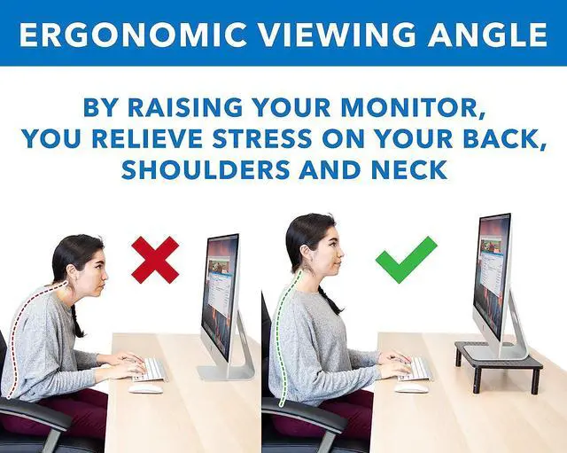 ERGONOMIC MONITOR STAND RISER: Elevate your workspace with our MOUNT-IT! Monitor Stand that reduces neck, back, and shoulder strain, promoting better health and comfort. This stylish riser enhances your desk' s ergonomics by providing optimal viewing angles and promoting passive heat ventilation and airflow for your devices.