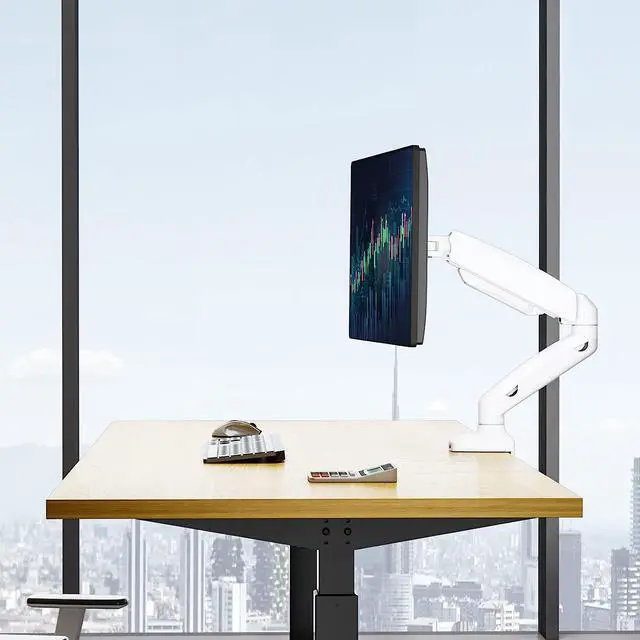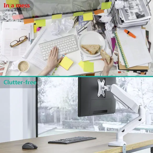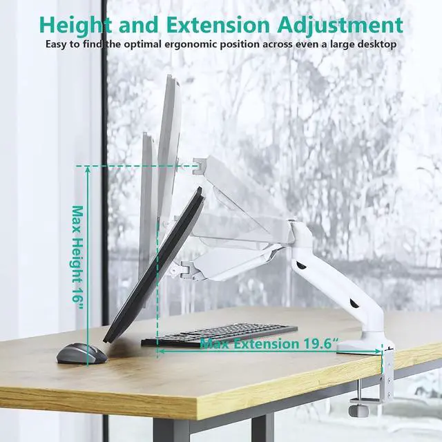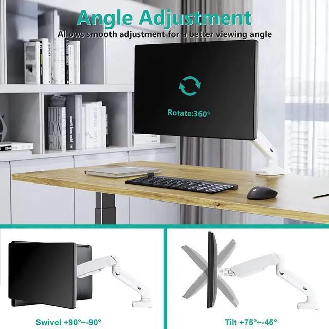 Fully Adjustable: The high-grade steel gas spring arm can be extended and retracted to your ergonomic position. Arm can swivel +180°/-180°. Monitor can tilt +75°/-45°, swivel +90°/-90°, and rotate +180°/-180°.