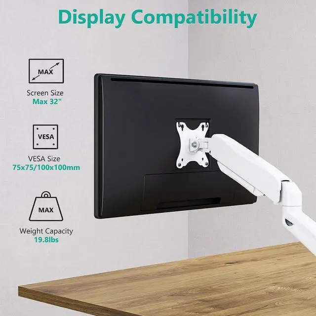 Compatibility: The single monitor arm fits most flat or curved LCD/LED screen from 17 to 32 inch, and supports up to 19.8 lbs with 75x75mm and 100x100mm Mounting Pattern mounting holes. The two-stage locking system is applicable to 0.4 - 3.3 thick desk for both C-clamp and Grommet Base.