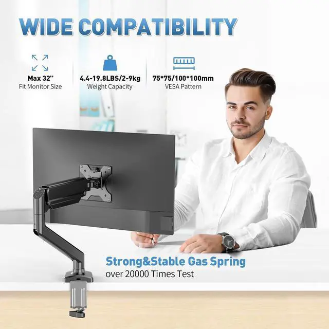 Universal Monitor Arm: Monitor desk mount arm provides upgraded loading capacity and can securely and easily hold monitors 13-32 inches and supports 4.4 - 19.8 lbs monitors. Compatible with VESA 75x75mm and 100x100mm.