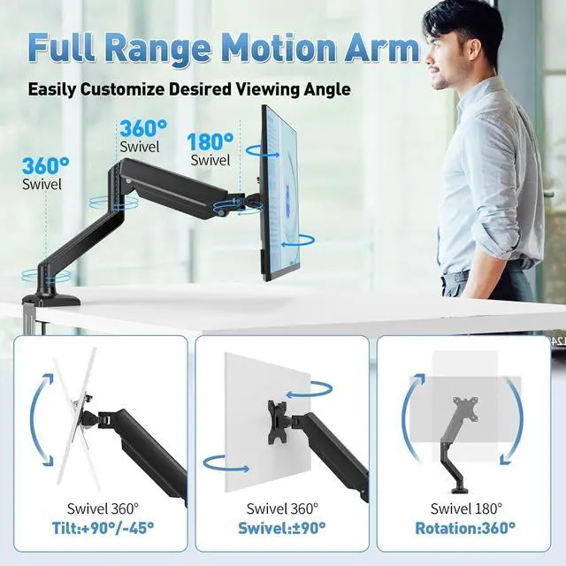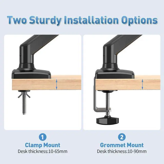 Effortless and Flexible Installation: Gas spring monitor arm is easy to install with c-clamp(desk thickness within 0.39 ' ' - 2.55 ' ' ) or grommet base mount(desk thickness within 0.39 ' ' - 3.54 ' ', Our monitor arm desk mount comes with all the required tools and accessories. The setup can be completed in 10 minutes.