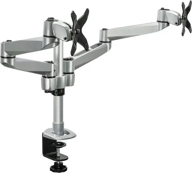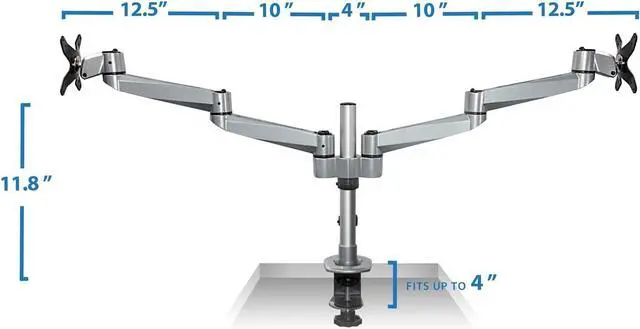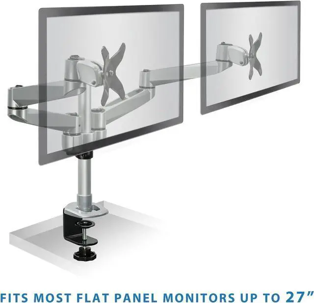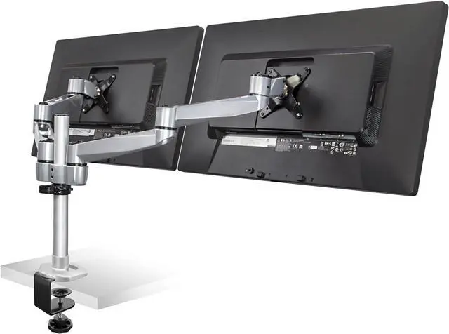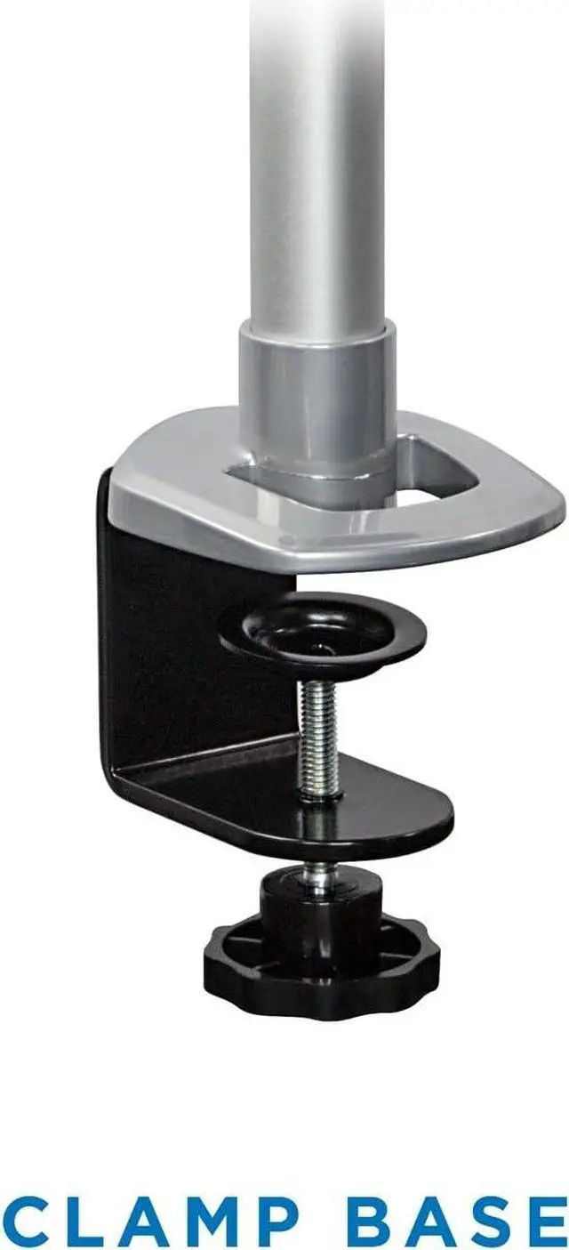 Dual monitor desk mount with clamp base provides ergonomic installation of two monitors. Save desktop space and increase your productivity with this premium two monitor stand.