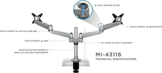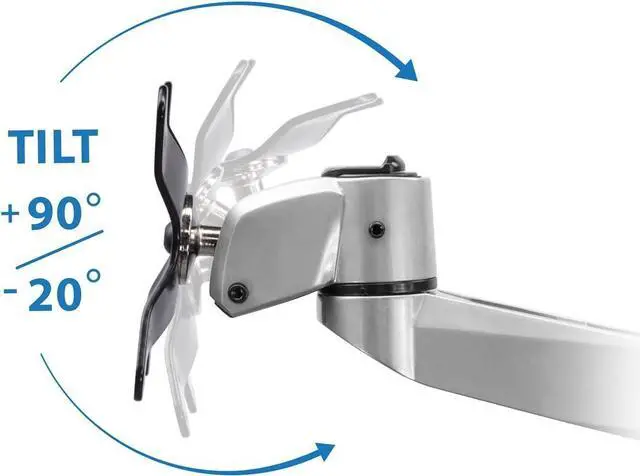 Full motion arms can swivel left and right. Monitor heads can rotate 360 degrees for landscape or portrait mounting, as well as tilt up and down for optimal monitor viewing angles
