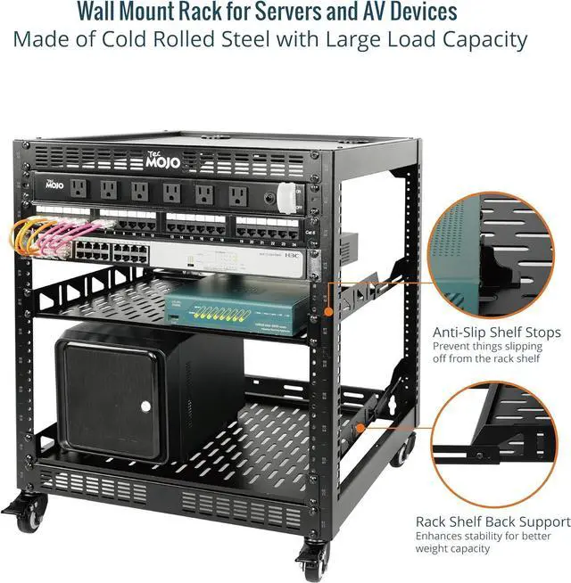 Powerful load-bearing12U Network Rack Open Frame constructed from durable Cold Rolled Steel; Rack Shelf Back Support enhances stability; load-bearing capacity of 260lbs