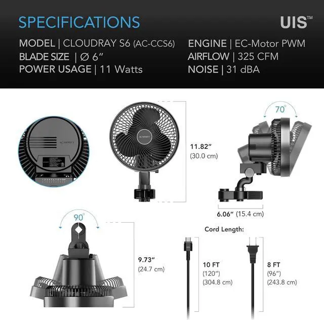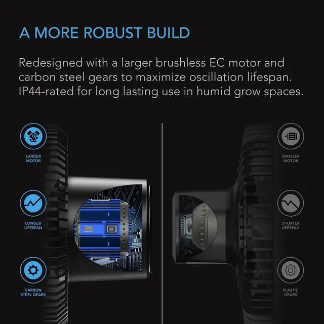 Next-gen clip fan re-engineered for longer-lasting, tailored circulation in grow space environments.