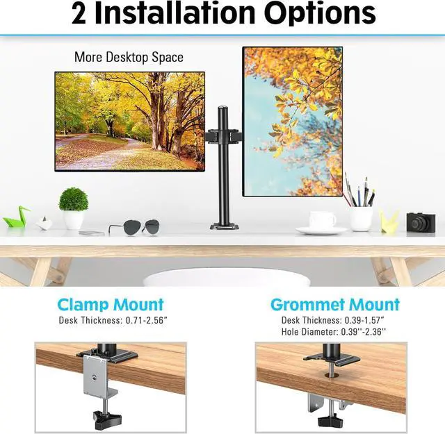 Easy Installation: Easy assembly with interchangeable C-clamp or grommet bases. Detachable VESA plates make it simple to attach or remove your monitors. The monitor desk mount come with clear instruction takes less than 15 minutes from start to finish.