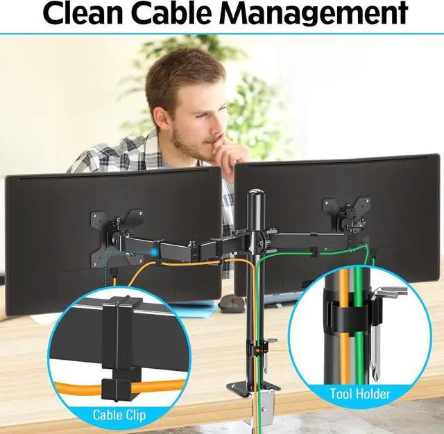 Free Up Your Desk Space: One solid base supports two monitor arms, helping you save table space and reduce clutter. Cable clips keep cables organized and protected. Just enjoy your working, gaming, or viewing hours in a more comfortable environment.